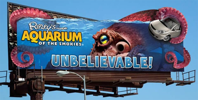 Nhìn vào biển quảng này, bạn sẽ ngay lập tức nhận ra một hình ảnh thuỷ cung với những chú bạch tuộc khổng lồ. Điều đó chắc chắn sẽ khiến bạn muốn tới ngay đó để tham quan, phải không? Với một biển quảng cáo vô cùng sáng tạo như vậy, Ripley’s đã chắc chắn đạt được mục đích của họ là thu hút khách hàng tiềm năng.
